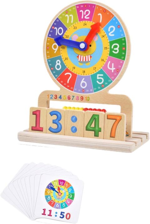 Шарен дрвен часовник со подвижни стрелки и плочки за поставување дигитално време. Вклучува картички со различни задачи за вежбање. Одличен начин за децата да научат да го читаат аналогното и дигиталното време преку игра и забава!